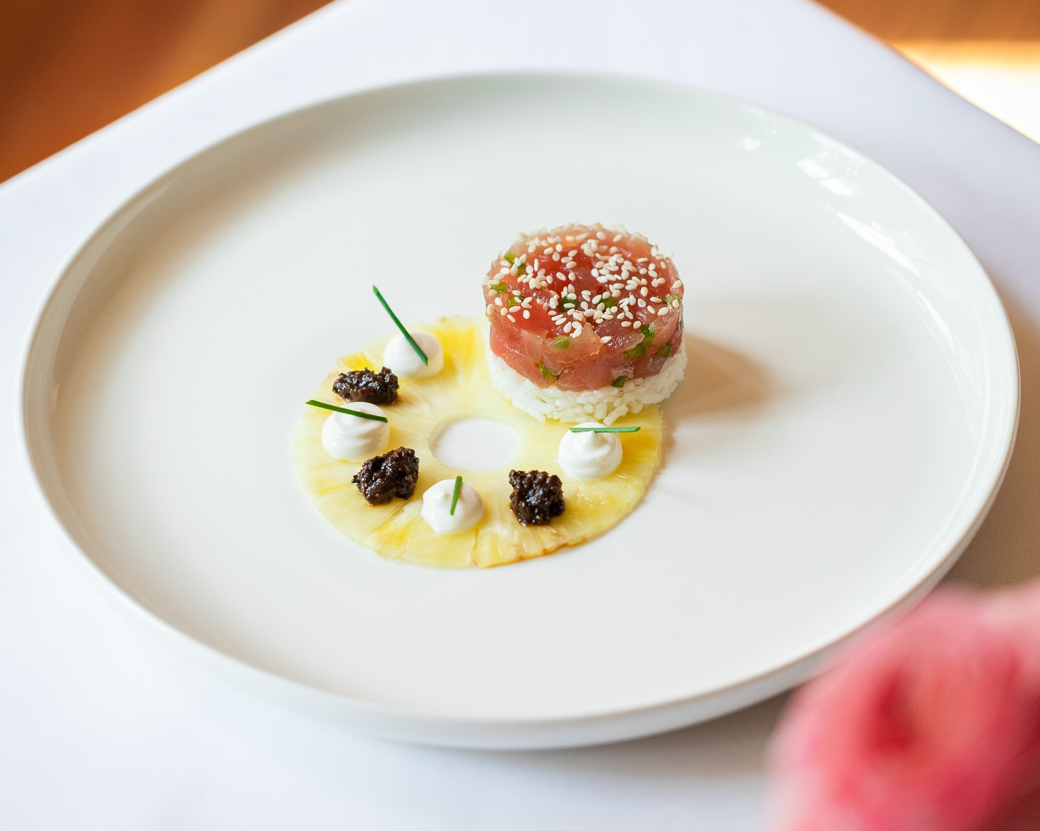 “This dish actually started as an idea for a pineapple taco,” Collins shares. “When that wasn’t practical, we took the same flavors—pineapple, jalapeño, tuna, rice—and layered them. The vanilla perfumes the dish, the yogurt balances the heat, and the black bean sauce adds an Asian note.”