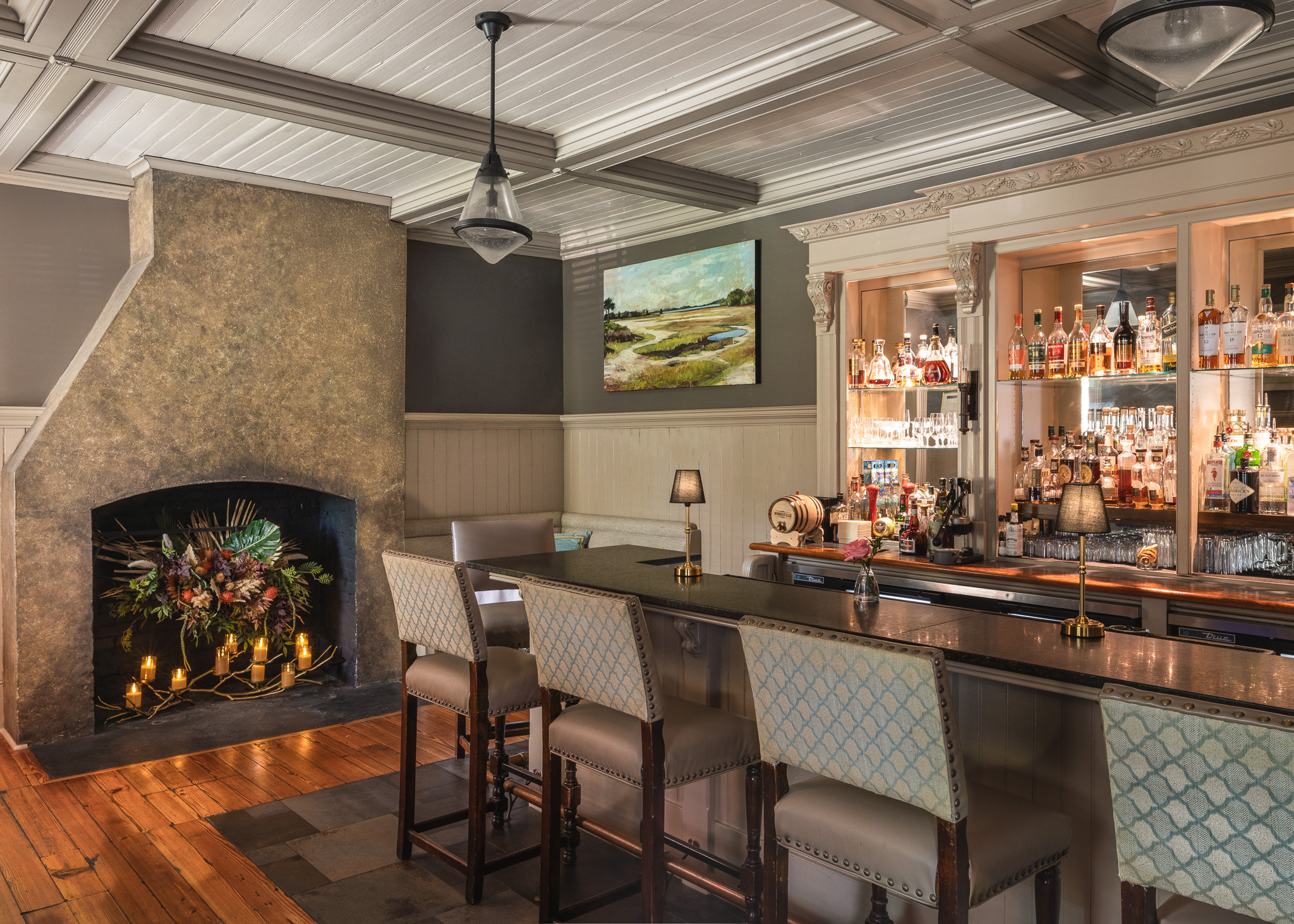 Occupying the estate’s original 1880s carriage house, the space is defined by historic heart pine floors and a flickering stone fireplace—a space that captures the timeless spirit of the ‘Holy City’.
